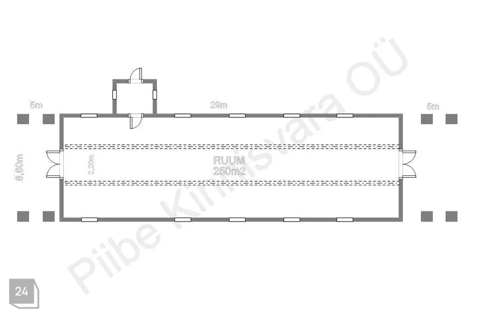 Hoone on katusealuse pinnaga kokku ca. 356m2, millest suletud kogupind on ca. 270m2 ja hoone otstes avatud katusealust pinda on kokku 2X43m2