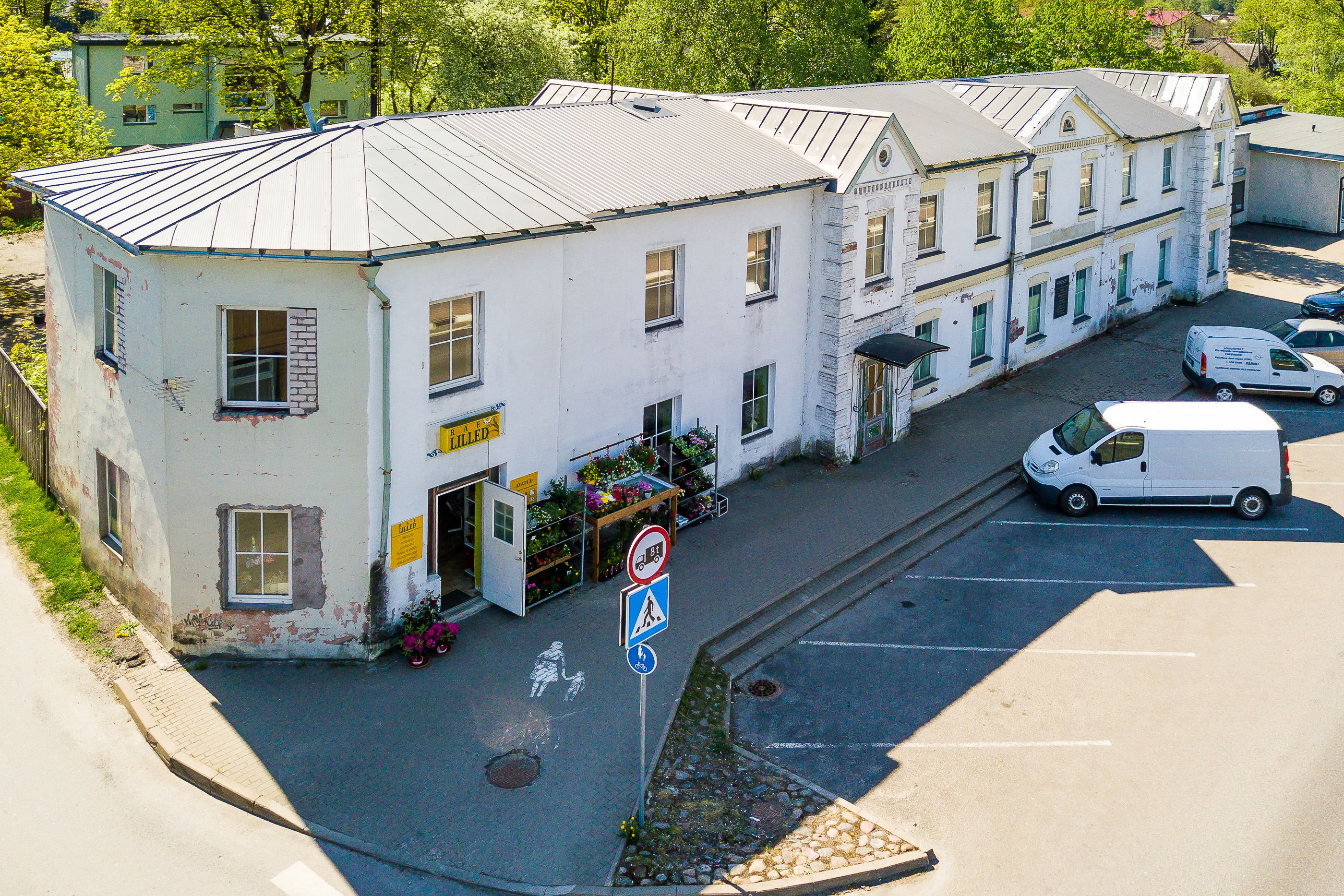 Esimesel korrusel asuvad äripinnad, mis on osaliselt rentnikega kaetud.