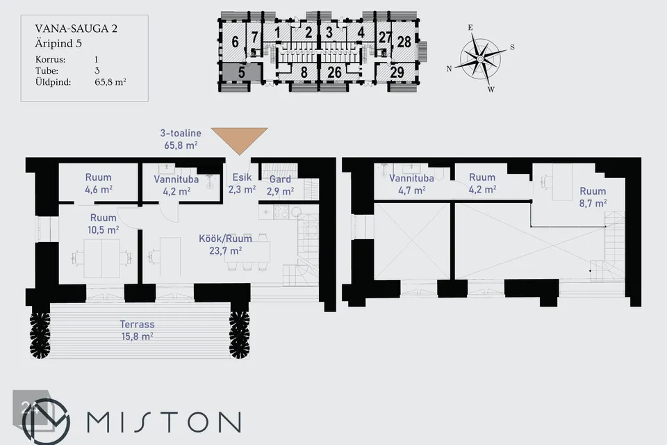 Vana-Sauga 2-5 on hea planeeringuga 2-toaline loft tüüpi äripind, mis asub kortermaja 1. korrusel. Äripind on läbi kahe korruse, koosneb avatud kööginurgaga toast, 2 abiruumist, 2 vannitoast, garderoobist, esikust ning pool korrusel asuvast toast. Terrass (15,8 m²) on avatud õhtupäikese poole.