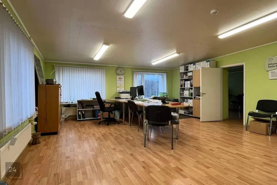 Esimesel korrusel asuvad töötajate puhkeruum, riietumisruum, väiksem kööginurk ning wc ja vannituba ning ka katlaruum ja 2 suurt laoruumi tõstukustega. Majas teisel korrusel asub suurem kontoriruum, puhkeruum ning kööginurk. Sisse jääb soovi korral kogu kontorimööbel.