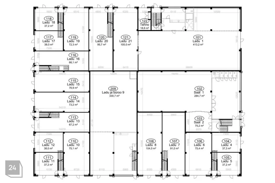 Ladu nr. 7 (1. korrusel ruum nr. 107) 91,4m², lae kõrgus 3,4m, hind (156 000.- € + km)