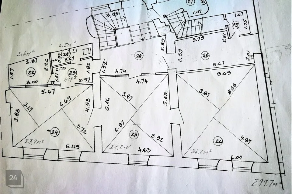 4. korrus - mitteeluruum 99,7 m2, mis jaguneb kolmeks toaks (23,7 m2, 27,2 m2, 36,7 m2) + kööginurk + wc/ duširuum. Pinnale on koridorist 2 sissepääsu.