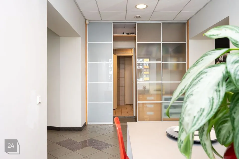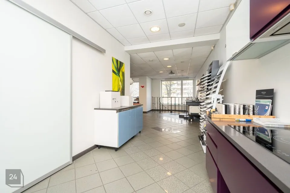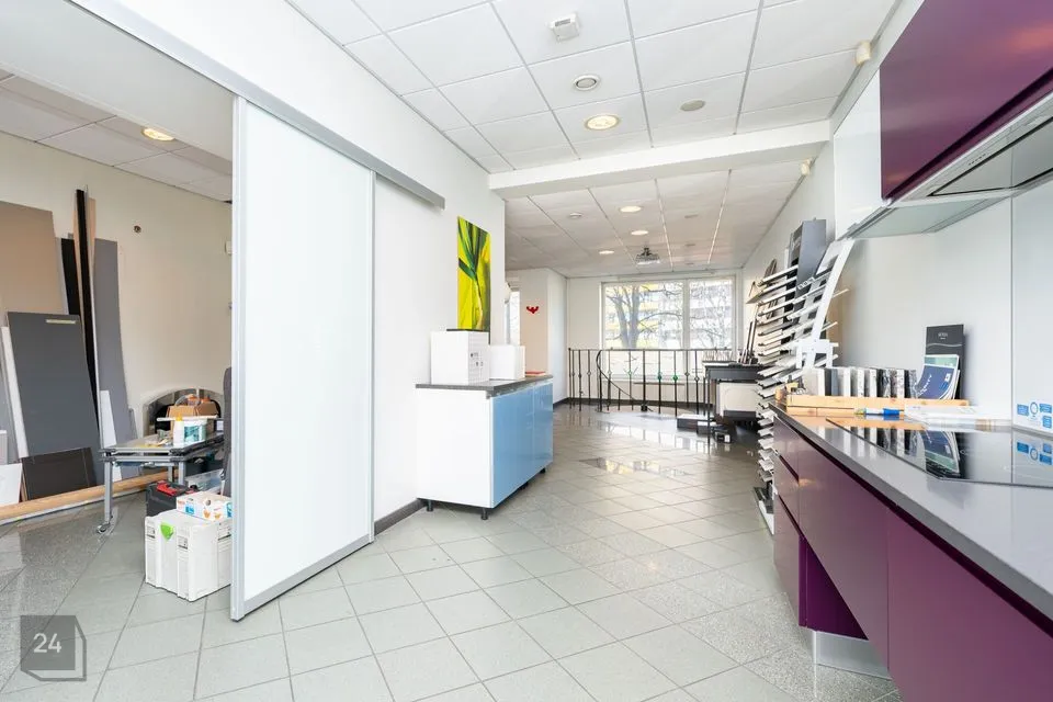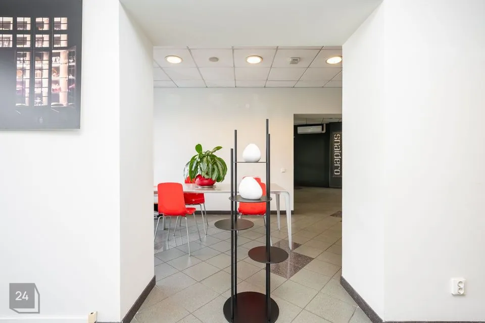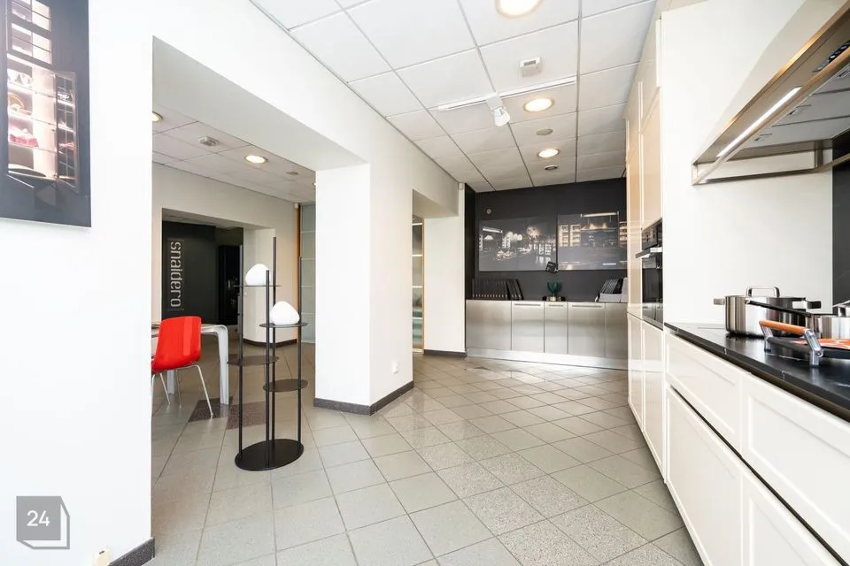 Ruumidel on kaks eraldi sissepääsu – üks null korruselt ja teine esimeselt korruselt. Siseruumid on viisakad, hooldatud ning plaaditud põrandatega. Suured vitriinaknad avanevad tänavale, tuues ruumidesse palju loomulikku valgust ja pakkudes suurepärast eksponeerimisvõimalust.