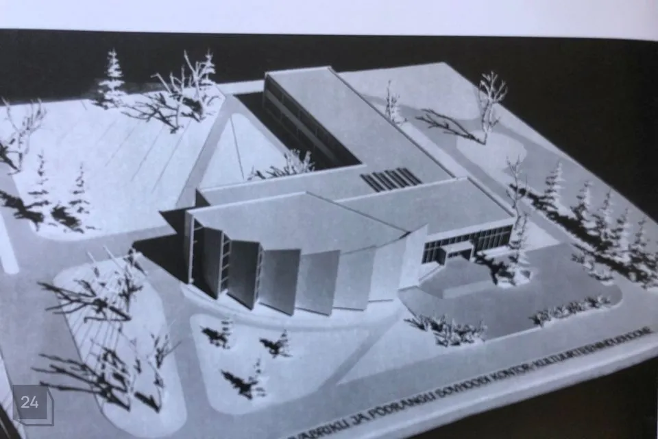Ehitatud on Narva plokkidest moodulitena (8 tk), ühe mooduli mõõtmed on 7,5m x 5m. Saali seina moodulid on kaetud skrafiitodega. Lehvikud on seotud nurkades maast laeni klaasakendega.
