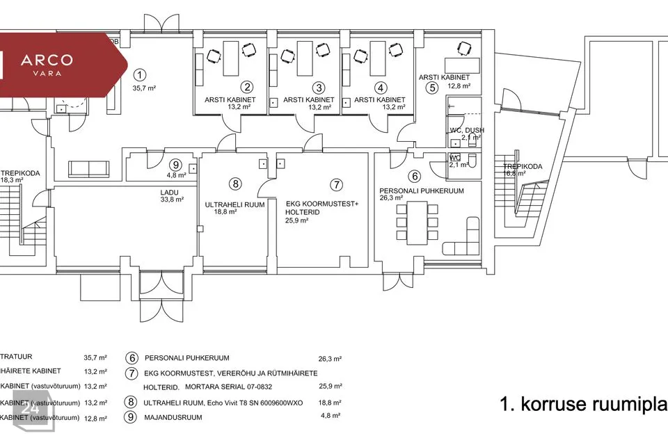 Hoone esimesel korrusel tegutseb üürilepingu alusel meditsiinilisi teenuseid pakkuv ettevõte. Erineva suurusega kabinetid pakuvad paindlikku töökorraldamise võimalust. Esimesel korrusel paikneb ka laopind.