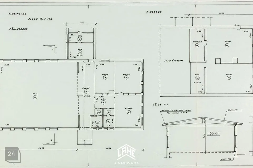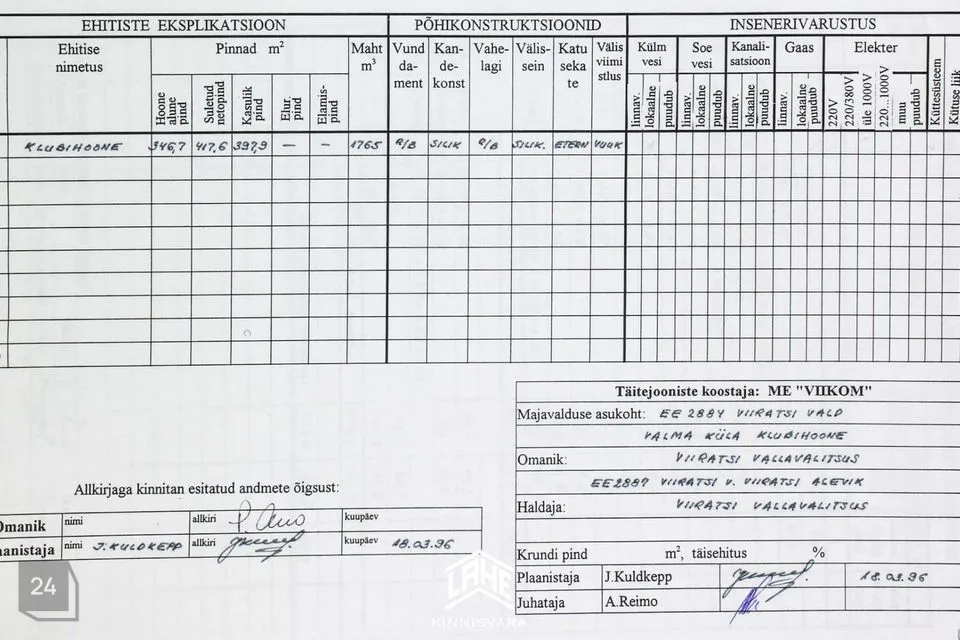 Kinnistul asub osaliselt säilinud kivi- ja betoonpaneelikonstruktsioonist klubihoone, mis on ühendatud ka kõrval kinnistul asuva hooneosaga. Hoone ehitisregistrisse kantud netopind kahel korrusel kokku 417,6m2.