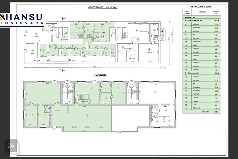 Esimesel korrusel pind on 264,4 m2, ning keldrikorrusel on veel 115,4 m2 laopinnad.