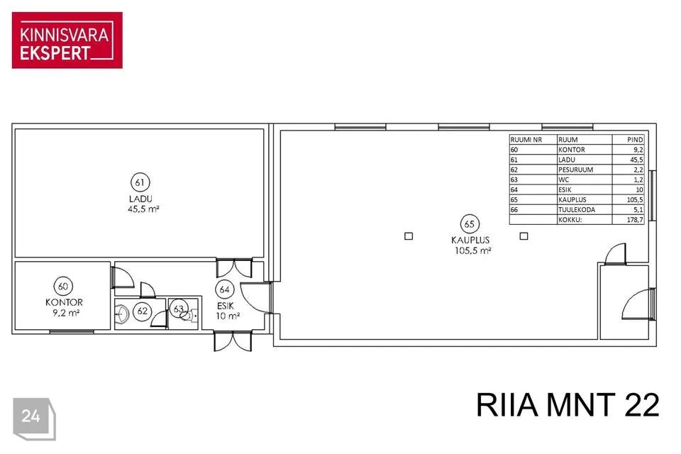 Kogu üüritav pind 178,7 m² koosneb ruumidest - kauplus 105,5 m², ladu 45,5 m² + abiruumid 9,2 + 2,2 + 1,2 + 10,0 + 5,1 m²