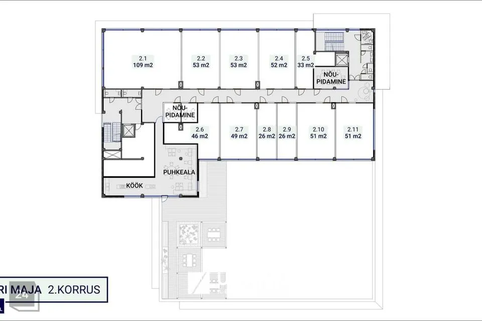 *4-korruseline ärihoone, kus 2. korrusel on olemas täisvalmidusega köök ja lounge’i ala, mis on mõeldud kõigile 2. – 4. korruse üürnikele ühiskasutuseks