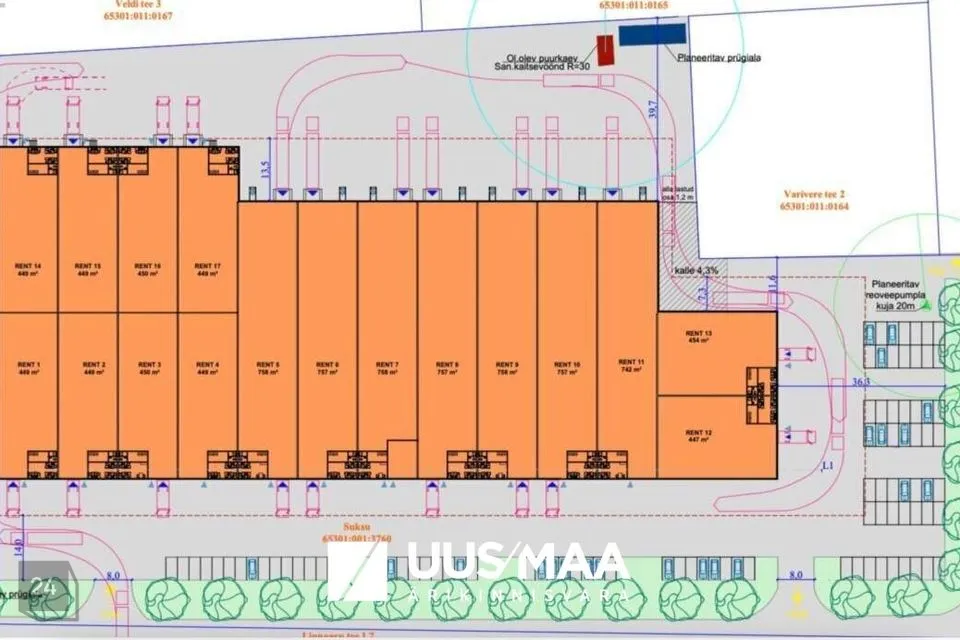 - Stock lao- ja tootmishoone kogu brutopind on orienteeruvalt 10 000m², välja üüritav pind kuni 9800m², mis on esialgselt jagatud kokku 15-ks erineva suurusega üüripinnaks, 470m²-720m² (vt joonist). Kõikidel üüripindadel on olemas laadimiseks ja kaubaveoks vajalik tõsteuks põranda tasandilt. Suurtele lao-tootmispinnale rajatakse hoone tagumisele küljele poolhaagistega autode teenindamiseks vajalikud estakaadid. Transpordil on võimaldatud liikumine ümber hoone.