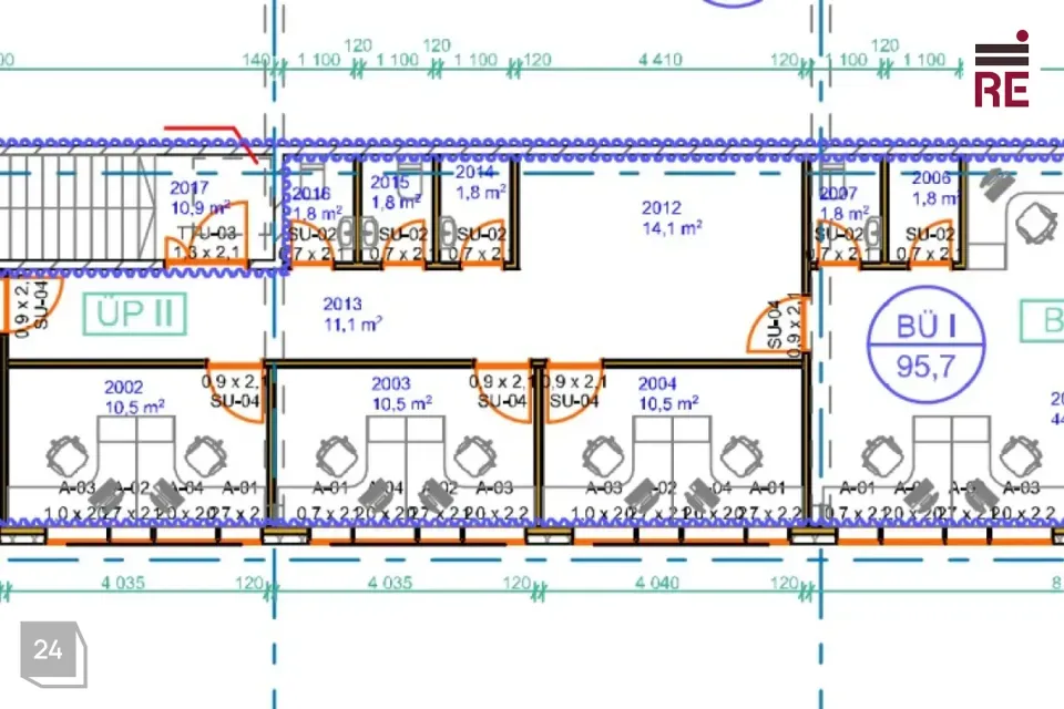 Teise korruse büroo, tähisega BÜ I, suurus 126,3 m², on jagatud viieks erineva suurusega kabinetiks. Äripinnal on olemas wc, puhkenurk ning kööginurga valmidus. Galeriis on näha sama hoone analoogilise büroopinna pildid.