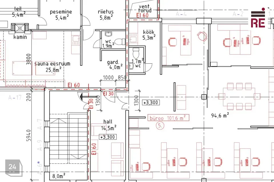 Hoone II korrusel asuv 164,4 m² suurune valgusküllane büroopind koosneb avatud tööalast, ning kabinettideks liigendatud osast. Lisaks on pinnal puhkeala, kööginurk, tualettruumid ja saun koos eesruumiga. Olemas on terrassi kasutamise võimalus.