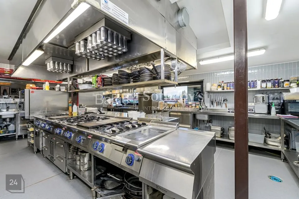 Kahekorruseline kohvik-baar, kus paiknevad köök, panipaigad, olmeruumid, jahutuskambrid ning teenindussaalid