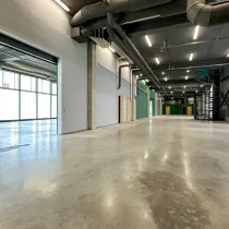 The commercial space includes necessary auxiliary rooms, and a goods lift with a capacity of 750 kg connects the second floor, enabling storage or production on the upper level. Loading is through a ground-level loading door. The loading door dimensions are 4.5 meters (width) x 4.25 meters (height). The commercial space has 2.3-meter-high glass doors, and there is a lift between the commercial and warehouse spaces measuring 3x3 meters.