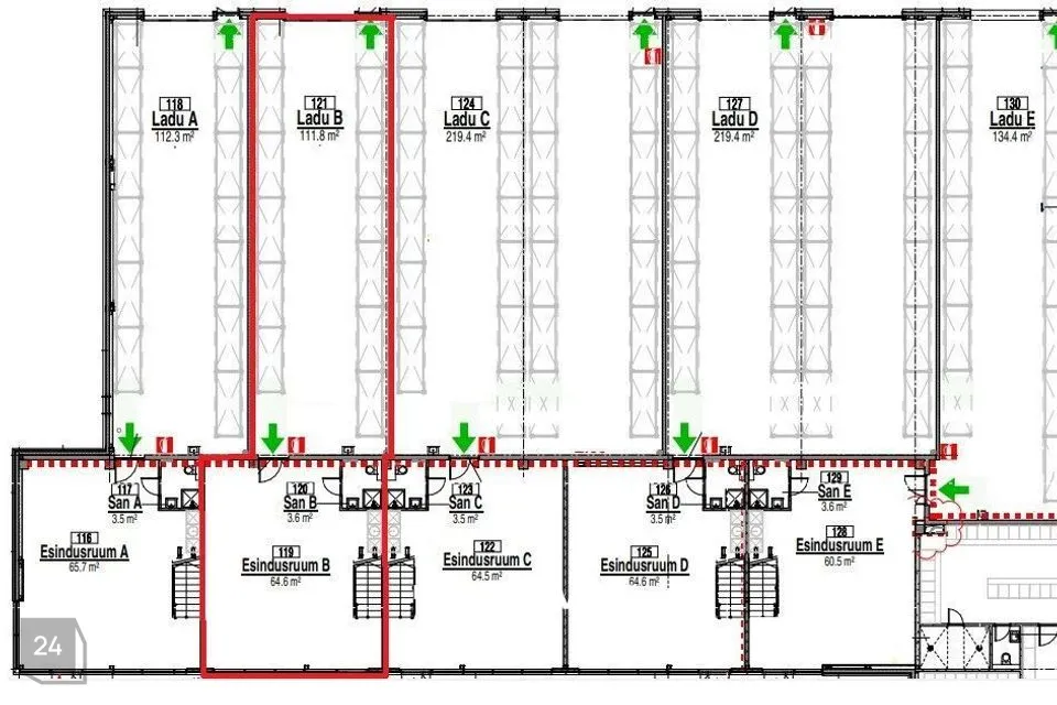1. korrus: esindusruum 64,6 m², san. ruum 3,6 m², ladu 111,8 m².