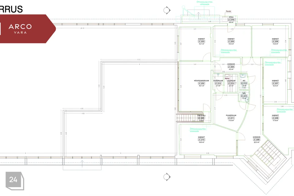 Teisel korrusel asuvad büroopinnad - 6 kabinetti, puhkeruum koos saunaga ning nõupidamisteruum.
