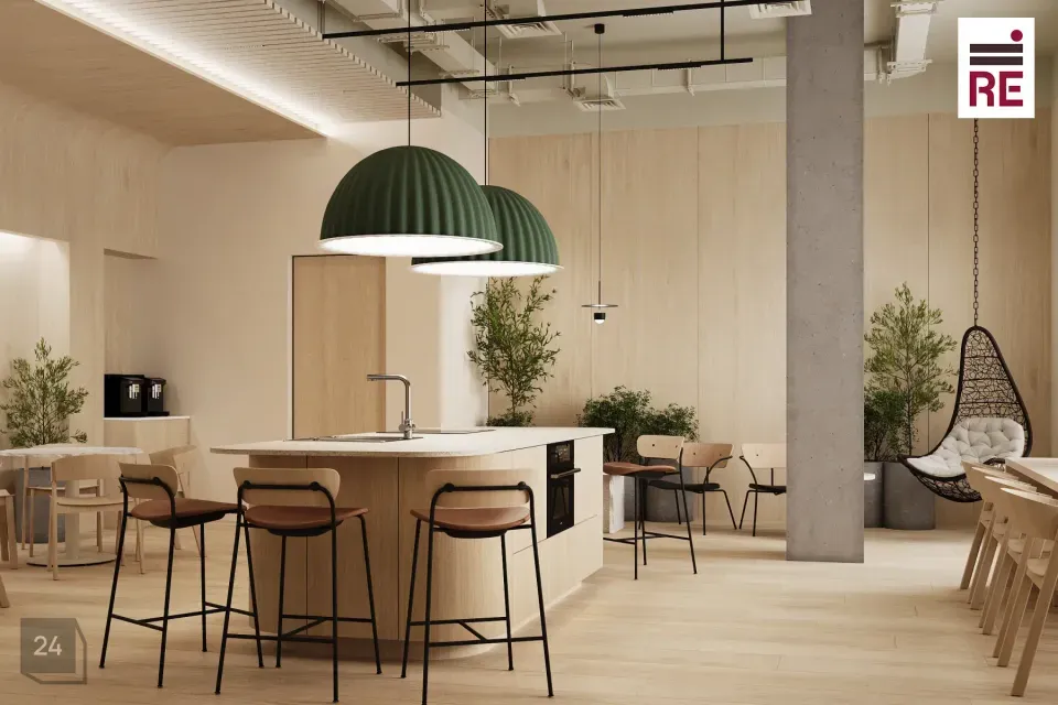 Kaasaegsed ja töötajate heaolule keskendunud büroopinnad, kus on puhkealad, vaiksed toad ja rohkelt loomulikku valgust.