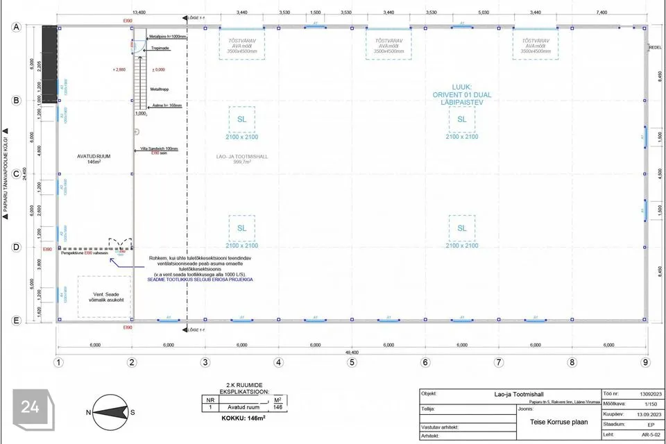 2. korrusel asub avatud ruum 146m², mida saab kasutada kontori või laoruumina või vastavalt otstarbele.