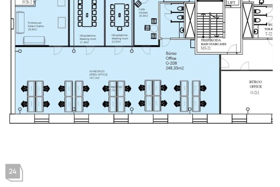 Bürooruumid on avatud planeeringuga, 3 nõupidamisruumi ja oma kööginurgaga.