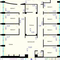 • Planeering: vastuvõtuala, 9 kabinetti, puhkeruum, 2 duširuumi, lao-panipaik ning WC-ruum. (Ruumi plaan on piltide galeriis).