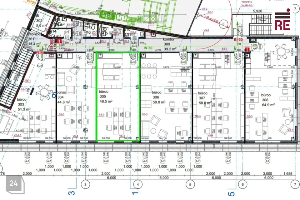 Maja teisel ja kolmandal korrusel asuvad büroopinnad 37-64 m2.