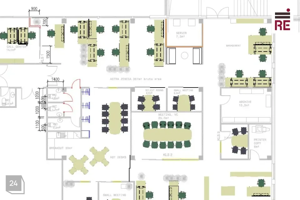 Tegu on valdavalt avatud planeeringuga bürooga, milles on erineva suurusega nõupidamisteruumid ja mõned eraldi kabinetid. Plaan on leitav pakkumise galeriist. Olemas on ka tualettruum ja köögiala.