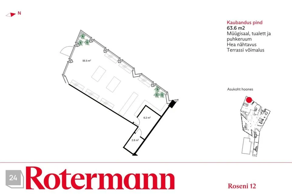 Suurepärase nähtavusega äripind Ahtri tänavalt, aadressil Roseni 12, Rotermanni kvartali südames.