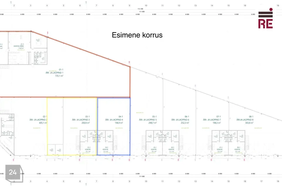 Esimese korruse müügi- või kontoripinnal on eraldi sissepääs ja maast laeni vaateaknad. Samuti on ka otseühendus laoga. Äripinna joonis on leitav pakkumise galeriist. Kuulutuses olevad pinna sisepildid on sama arendaja 2022. aastal valminud analoogsest hoonest. Hoones on kokku üüritavat pinda ca 3900 m². Vajadusel saab pinna planeeringut muuta. Enda erisoovidest olete oodatud teada andma, ehituse käigus saab bokse kohandada üürniku soovidele vastavalt.
