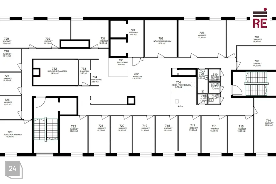 Ruumid jagatud valdavalt väikesteks 1-2 inimese kabinettideks, lisaks mõned suuremad 2-3 inimese kabinetid ja kaks nõupidamisruumi.