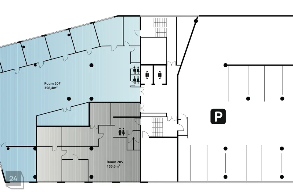 Pind jaguneb: suur avatud ala, 6 kabinetti, koosolekuruum, kaks köögi/puhkeala, panipaik, tualetid.