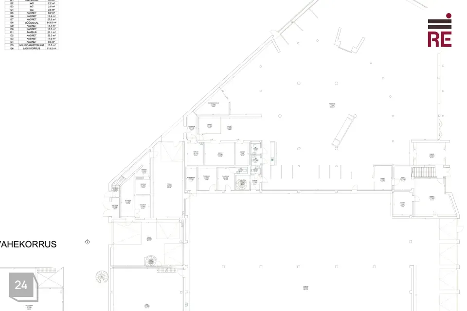 1. korrusel paikneb müügisaal 843 m², eri suuruses kontoriruumid ca 175 m², töökojad ja laod ca 1717 m² ning abiruumid ja wc-d ca 116 m². Esimesel korrusel on pinda kokku 2850,7 m².
