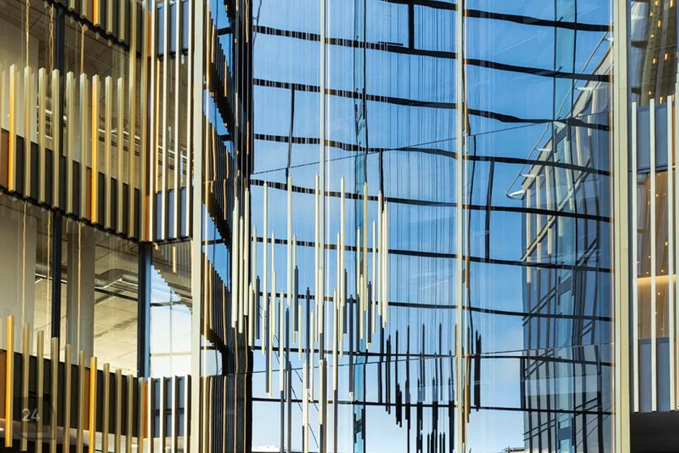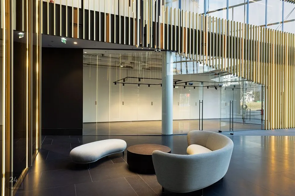 Büroohoone esindusliku fuajee kohal kõrgub läbi kuue korruse ulatuv klaasseinte ja -katusega aartium. Hoones on kolm klaasist seintega lifti.