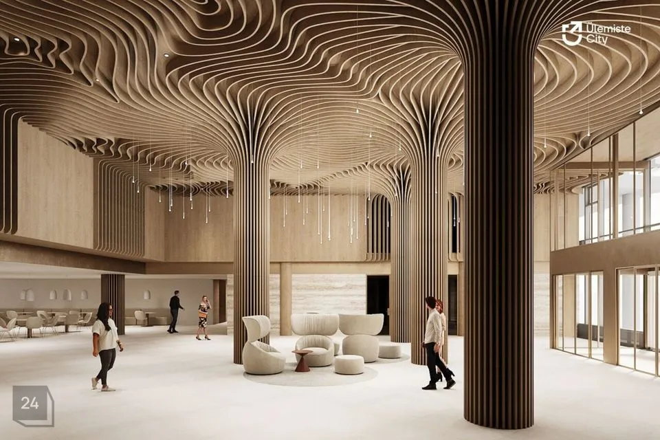 Tammespoonist paneelid, hingavad materjalid ja hoolikalt valitud taimestik toovad looduse hoonesse sisse.