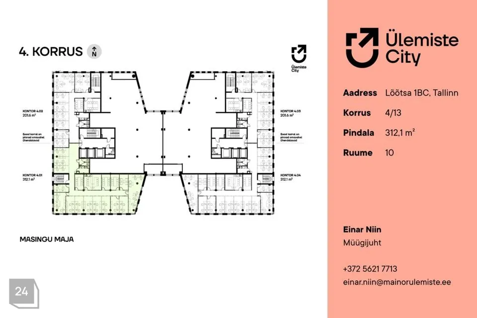Büroopind asub Masingu maja B-torni 4. korrusel, pakkudes eksklusiivseid ja inspireerivaid vaateid nii Ülemiste Cityle kui ka Ülemiste järvele. Suured aknad toovad ruumidesse rohkelt loomulikku valgust ning loovad kaasaegse ja motiveeriva töökeskkonna.