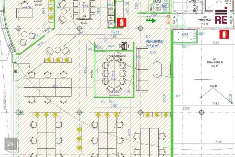 Pinda on võimalik jagada kaheks bürooks (ca 131m² ja 82m²), köögi- ja tualetiala oleks sel juhul ühiselt jagatav.
