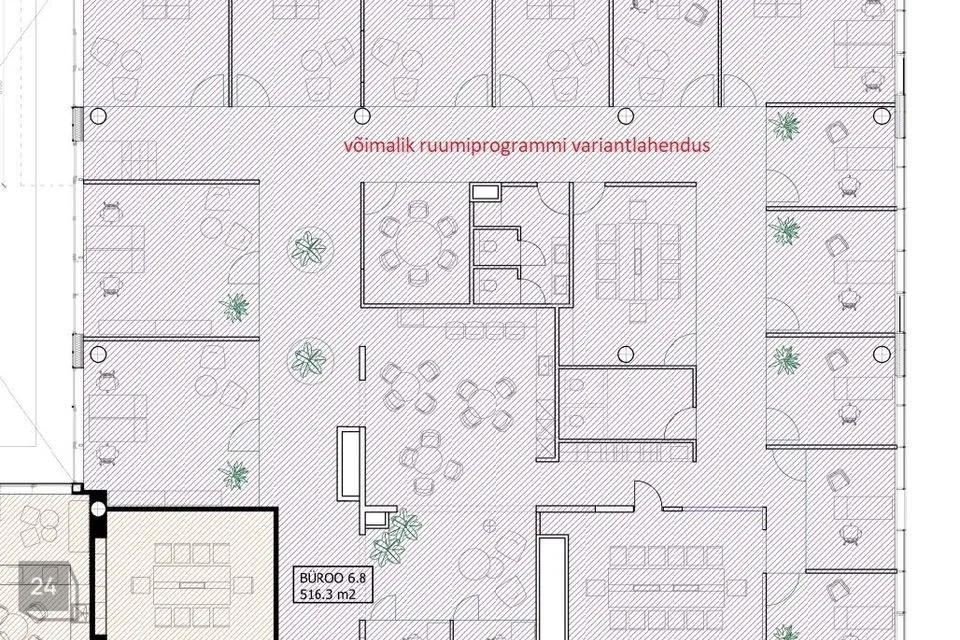 Büroopinna planeeringus sisalduvad hetkel kaks suurt tööala ja kaks nõupidamiste ruumi. Tualetid ja duširuum asuvad pinna kõrval ühisalas, aga need saab ehitada ka büroopinnale koos köögiga.