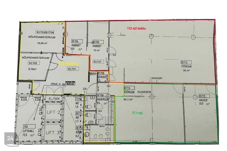 Äripind koosneb kahest eraldi kontoriruumist, vastavalt 54,1 m2 ja 23,0 m2 - plaanil rohelisega piiritletud ala.