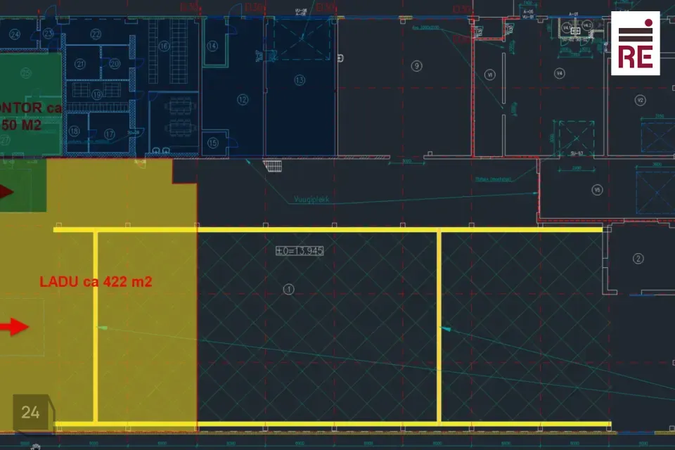 Äripinnal on lao-/tootmispind 422 m² ja kontor 50 m². Lisaks on võimalik hoone 2. korrusel, olme-ja kontoriosa peal, üürida veel ca 350 m² pinda, mis on hetkel väljaehitamata. Hoone esimese korruse plaani leiate piltide galeriist.