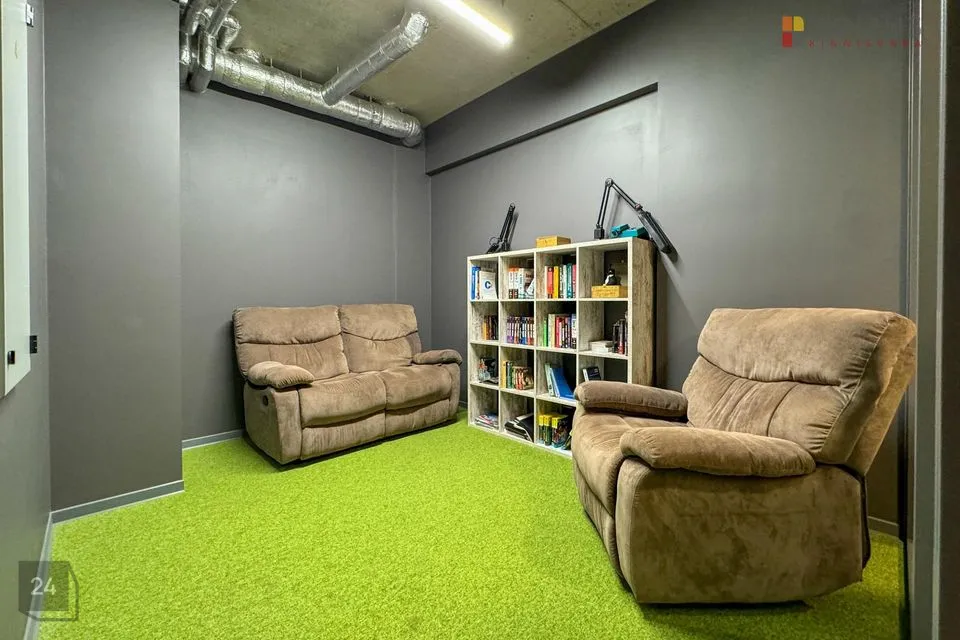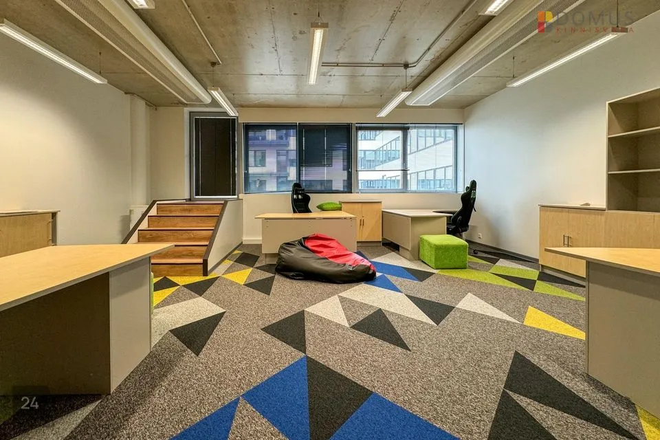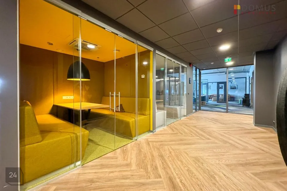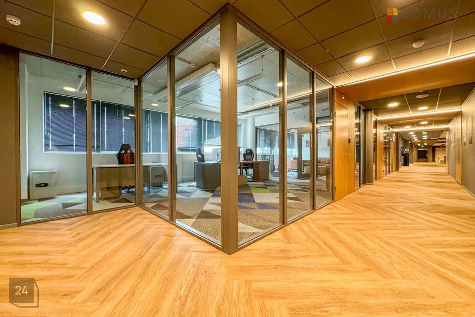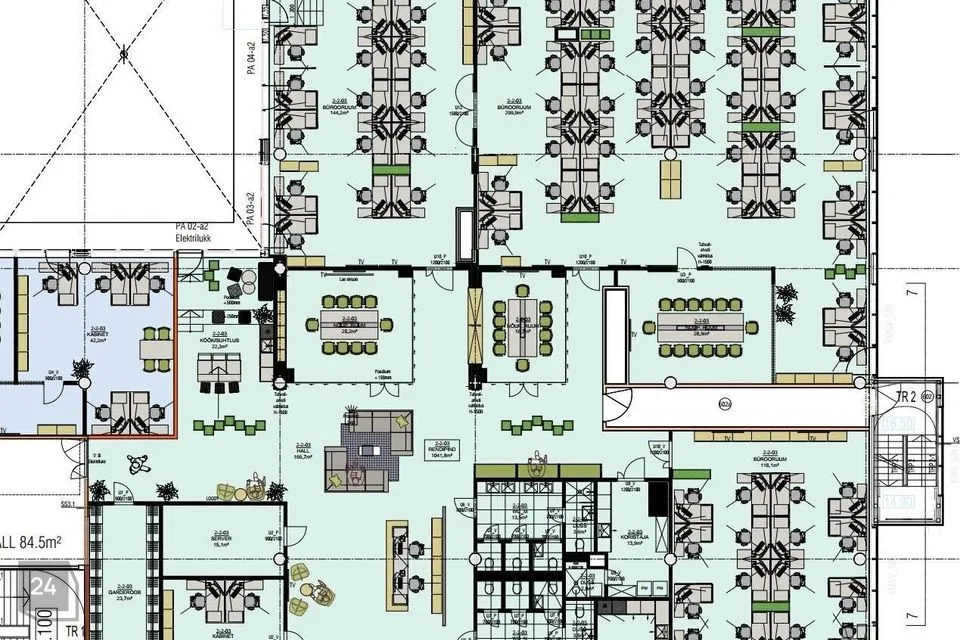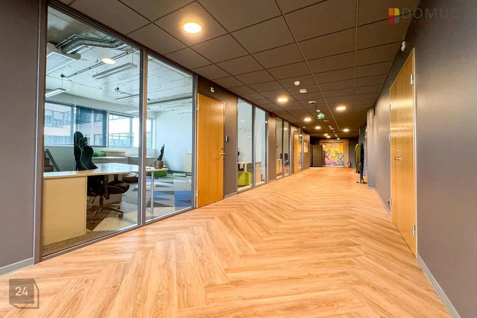 Büroopinnal on mitu avatud planeeringuga tööala, kuus kabinetti, 7 eri suurusega koosolekuruumi, serveriruum, laoruum, garderoob ja koristajaruum, kaks kööki, eraldi tualetid ja kaks suurt san. ruumi (duširuumidega).