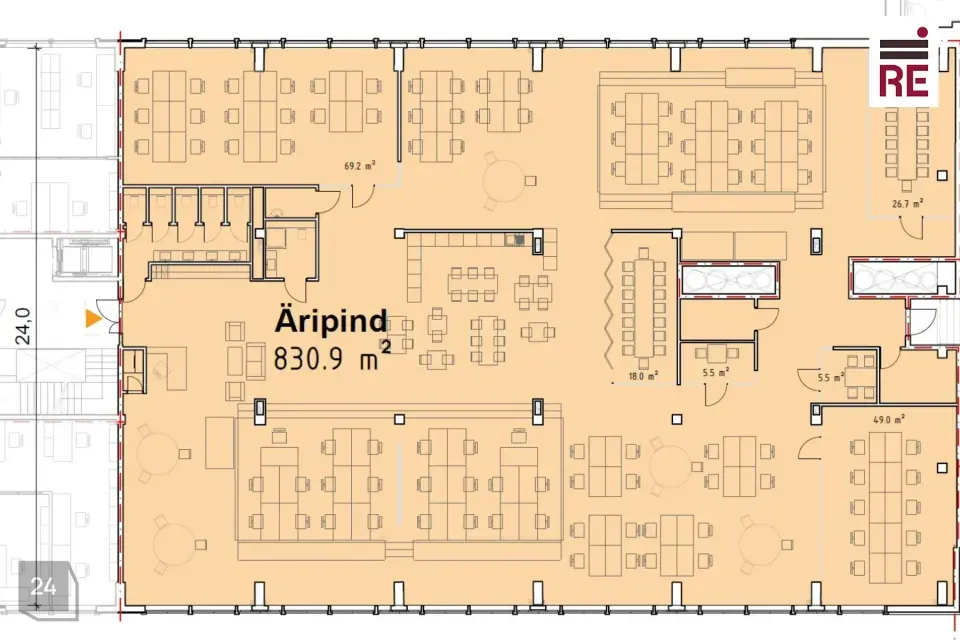 Lisaks on büroos köök-puhkeala ja olmeruumid. Ruumide plaanid on leitavad pakkumise galeriist. Pind antakse üle möbleerimata.
