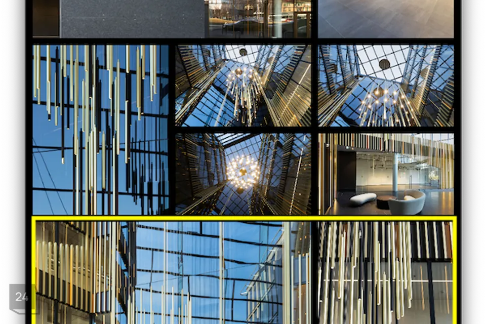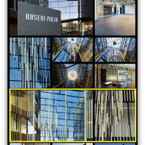 Büroohoone esindusliku fuajee kohal kõrgub läbi kuue korruse ulatuv klaasseinte ja -katusega aartium. Hoones on kolm klaasist seintega lifti.