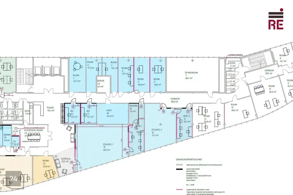 Üüripind koosneb erineva suurusega kabinettidest, nõupidamisteruumidest, vastuvõtualast, kööginurgast ja olmeruumidest. Pinna joonise leiate pakkumise galeriist. Üüripinna planeeringut võimalik kokkuleppel üürileandjaga muuta.