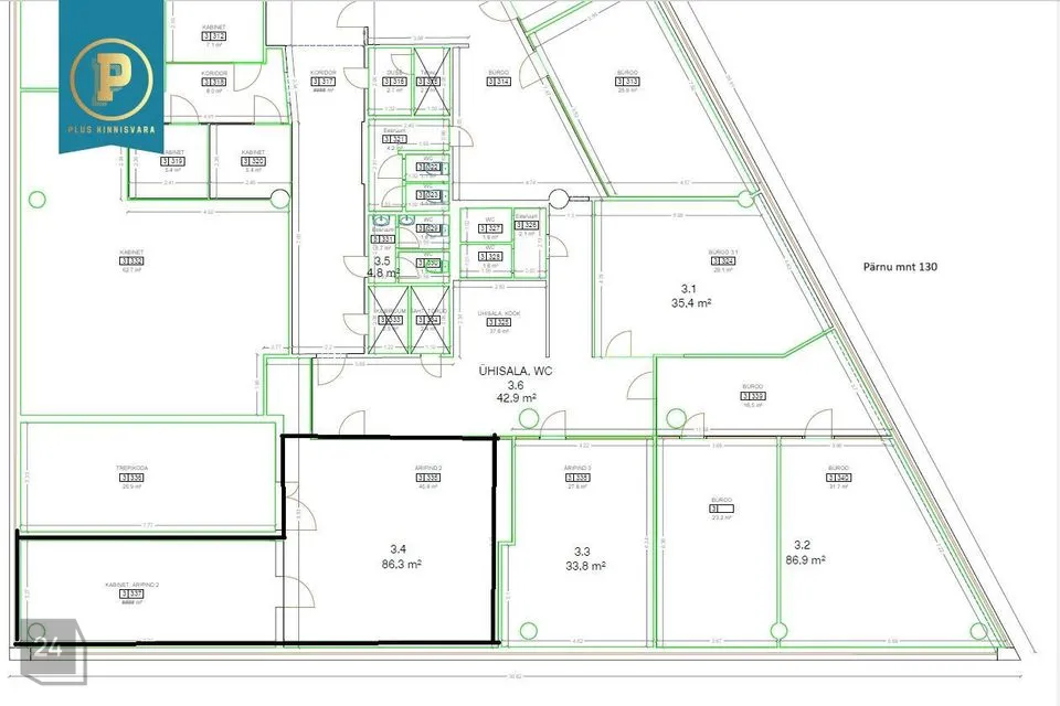 Üürile anda Kesklinna linnaosas, Pärnu mnt 130 aadressil asuvas ärihoones 86,3 m² suurune värskelt renoveeritud büroopind.