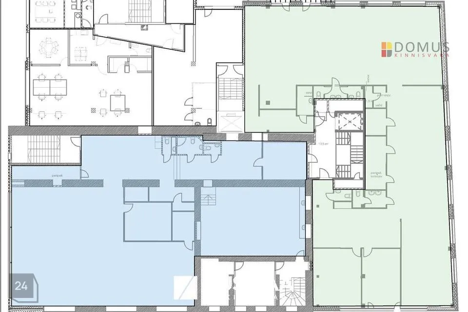 Ruumide plaan on leitav piltide galeriis (markeeritud sinise värviga). Lisaks on võimalik võtta juurde pind suurusega 411 m² (markeeritud ruumide plaanil rohelisega)
