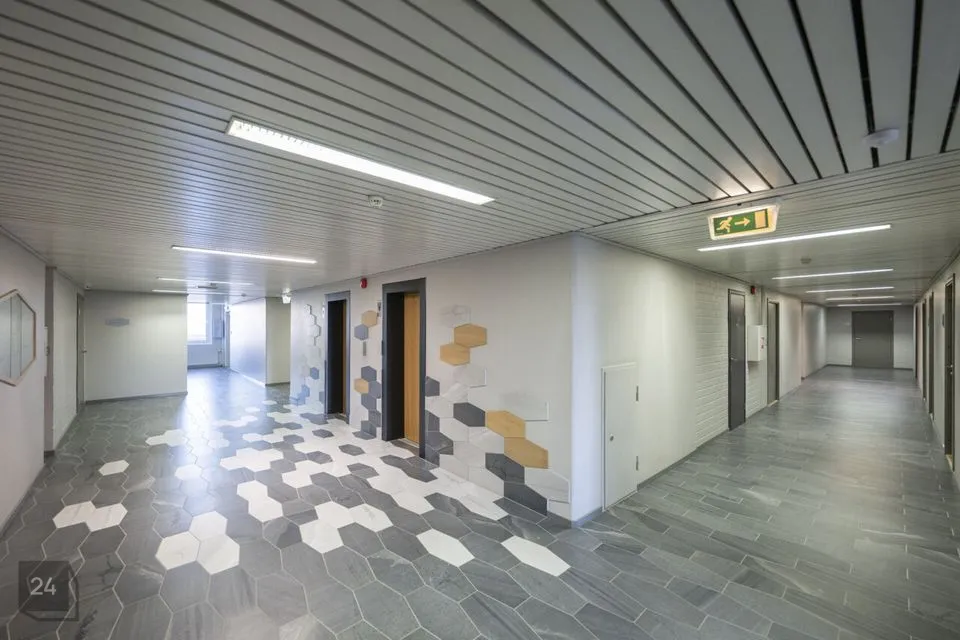 A-korpuses asub peamine sissepääs koos avara fuajee ja bürooruumidega.