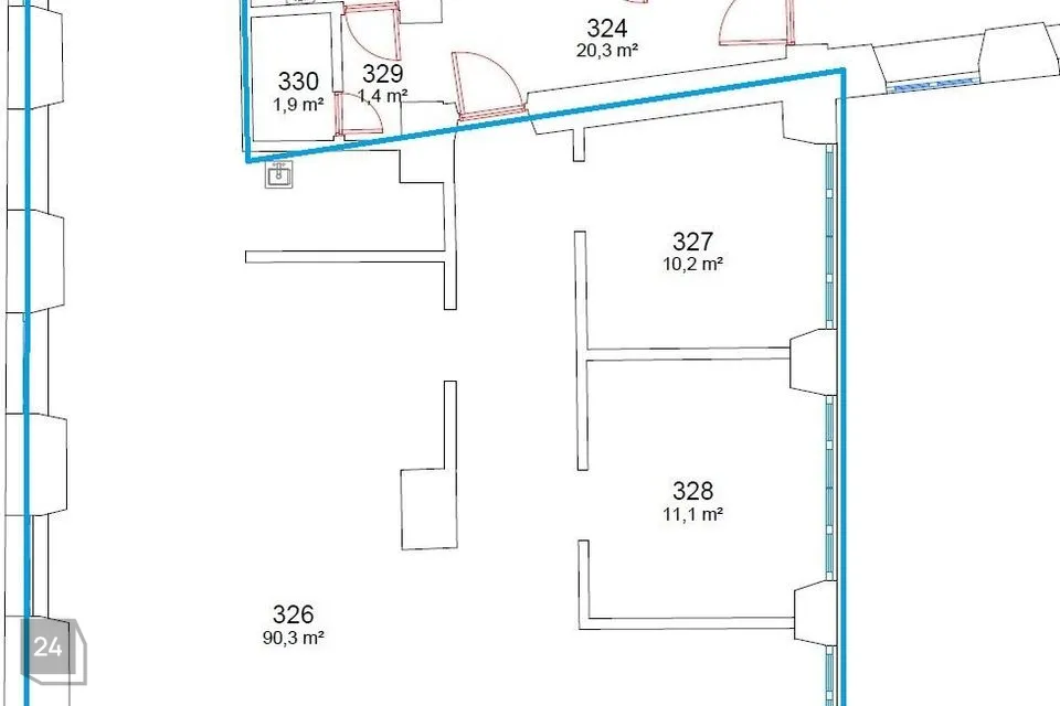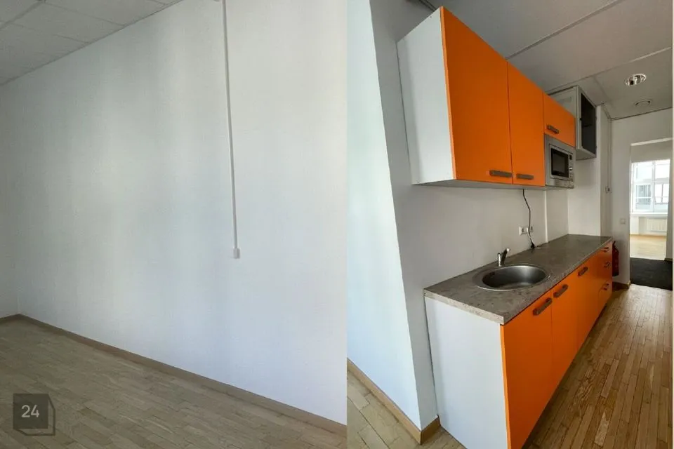 Ruumid jaotuvad suuremaks avatud L-kujuliseks tööruumiks, olemas on 2 eraldi tuba (puhkeruum, koosolekute ruum või kabinetid) ning kööginurk (sh külmik, mikrolaineahi).