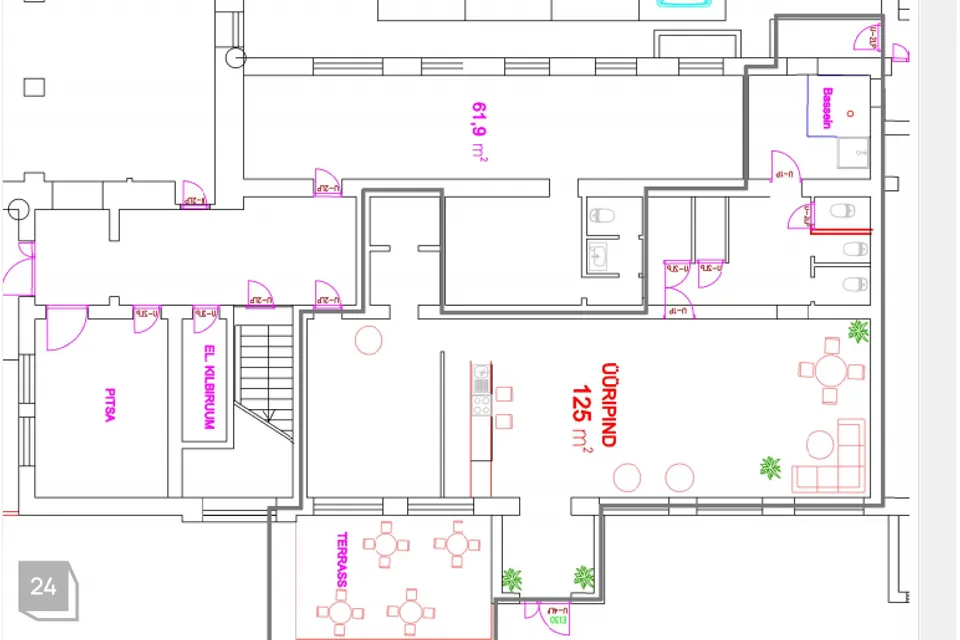 Pinnale 2 sissepääsu (hoone küljelt koos terrassiga ja peatänavalt, kütteks soojuspump).