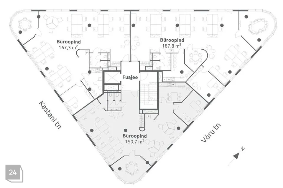 Kastani Kolmnurgas saab kokku olema ca. 2 200 m2 üüritavat pinda, millest ligi 1 450 m2 moodustavad büroopinnad. Büroopinnad asuvad kolmandast kuni viienda korruseni ja võimaldavad luua erinevaid praktilisi ruume, mis vastavad just teie ettevõtte vajadustele. Hoone kolmnurkne disain võimaldab teil luua ruumikaid koosolekuruume või privaatsemaid kabinette, mis tagavad ergonoomilise ja produktiivse töökeskkonna.