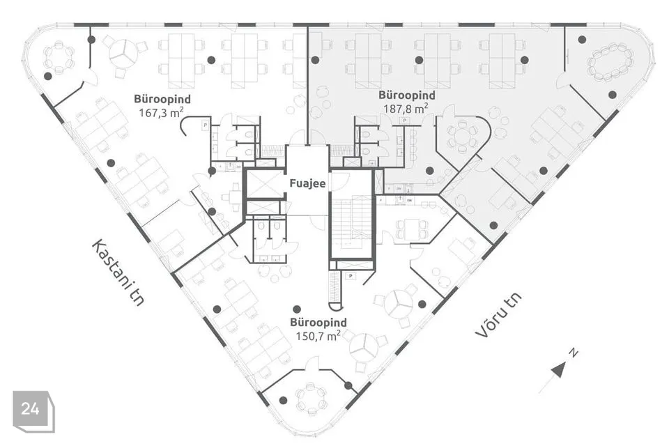 Kastani Kolmnurgas saab kokku olema ca. 2 200 m2 üüritavat pinda, millest ligi 1 450 m2 moodustavad büroopinnad. Büroopinnad asuvad kolmandast kuni viienda korruseni ja võimaldavad luua erinevaid praktilisi ruume, mis vastavad just teie ettevõtte vajadustele. Hoone kolmnurkne disain võimaldab teil luua ruumikaid koosolekuruume või privaatsemaid kabinette, mis tagavad ergonoomilise ja produktiivse töökeskkonna.