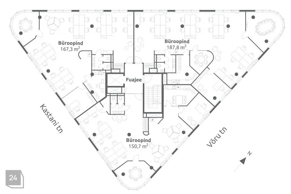 Kastani Kolmnurgas saab kokku olema ca. 2 200 m2 üüritavat pinda, millest ligi 1 450 m2 moodustavad büroopinnad. Büroopinnad asuvad kolmandast kuni viienda korruseni ja võimaldavad luua erinevaid praktilisi ruume, mis vastavad just teie ettevõtte vajadustele. Hoone kolmnurkne disain võimaldab teil luua ruumikaid koosolekuruume või privaatsemaid kabinette, mis tagavad ergonoomilise ja produktiivse töökeskkonna.